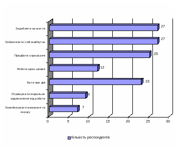 Економічні методи управління у ДМСУ базуються в першу чергу на матеріальних стимулах праці: оплаті праці. Щоб перевірити, чи справді в роботі персоналу підприємства економічні методи управління та їх конкретні форми здійснюють вирішальний вплив на працівників, що веде до підвищення продуктивності праці, було проведено анкетування з визначення життєвого кредо та власної мотивації кожного працівника. Результати опитування представлено на рис. 2.1.