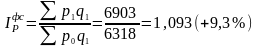 В числителе дроби — условная стоимость произведенных в текущий период товаров в ценах базисного периода, а в знаменателе — фактическая стоимость товаров, произведенных в базисном периоде. Данный индекс показывает, во сколько раз возросла (уменьшилась) стоимость продукции из-за роста (снижения) объема ее производства или сколько процентов составляет рост (снижение) стоимости продукции в результате изменения физического объема ее производства. Если из значения индекса физического объема продукции вычесть 100%, то разность покажет, на сколько процентов возросла (уменьшилась) стоимость продукции в текущий период по сравнению с базисным из-за роста (снижения) объема ее производства. Разность числителя и знаменателя (Σp0q1 - Σ p0 q 0 ) показывает, на сколько рублей изменилась стоимость продукции в результате роста (уменьшения) ее объема.