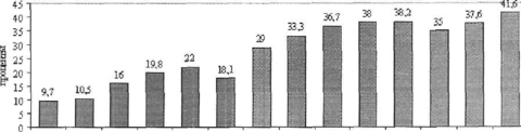 Рис. 1.1. Доля таможенных платежей в доходной части федерального бюджета в 1991-2004 гг.