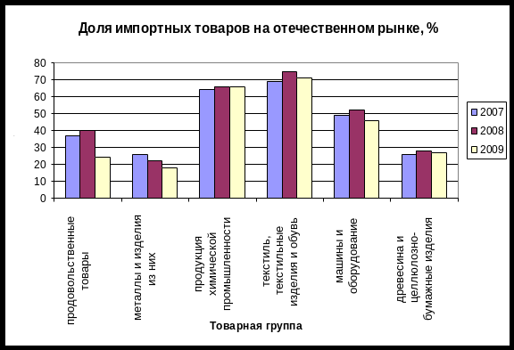 Доля импортной текстильной продукции на российском внутреннем рынке составляет 75% от общего объема рынка, что способствует вытеснению продукции отечественной текстильной и швейной промышленности дешевой импортной. Доля зарубежных поставщиков возросла по продукции пищевой промышленности с 37 до 40%, деревообрабатывающей – с 26 до 28, металлургической упала – с 34 до 22%, а по продукции химической промышленности – осталась на прежнем уровне (66%). Несколько выросла доля импорта на рынках товаров легкой промышленности – с 57 до 61%, и существенно, с 36 до 52%, – на рынках машин и оборудования. Отечественное производство обеспечило 75% прироста объемов рынка продовольствия, 74 – продукции лесопереработки и 80% – металлопродукции. Импорт закрыл 63% прироста потребностей в продукции легкой промышленности, 67 – химической и 55% – машиностроения. Ситуация на внутрироссийском рынке спортивных товаров характеризуется обострением конкуренции, усилением позиций крупных международных компаний (доля импортных изделий на рынке составляет 40-65%), развитием региональных рынков, Доля цветов российского производства составляет чуть более 8% от общего объема продаж, остальная часть приходится на импорт. В 2009 г. видна тенденция к снижению доли импортной продукции по отношению к отечественной, но она все равно остается высокой, это угрожает экономической безопасности России. (рис. 1)