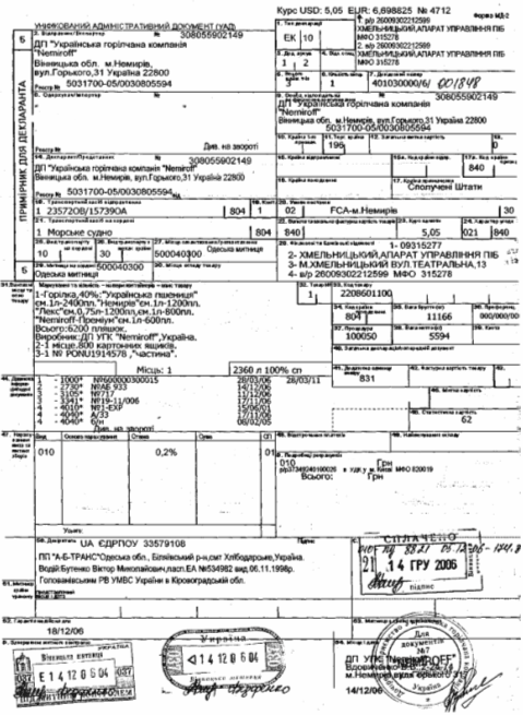 Рис.2. Приклад оформлення експортної ВМД при експорті горілчаної продукції в США морським транспортом (з доставкою контейнерів доморського порту по Україні митним перевізником)