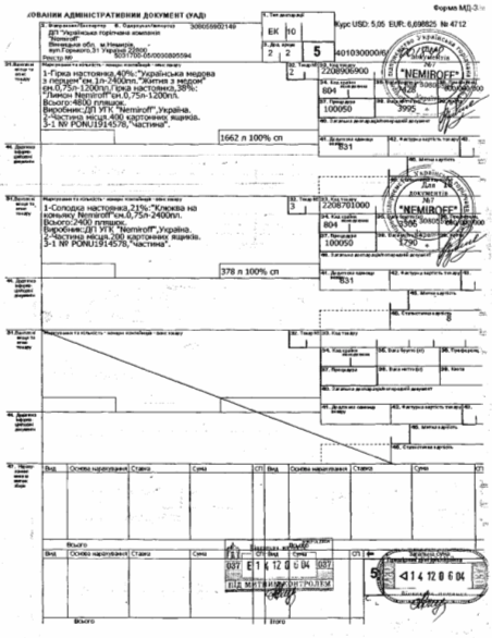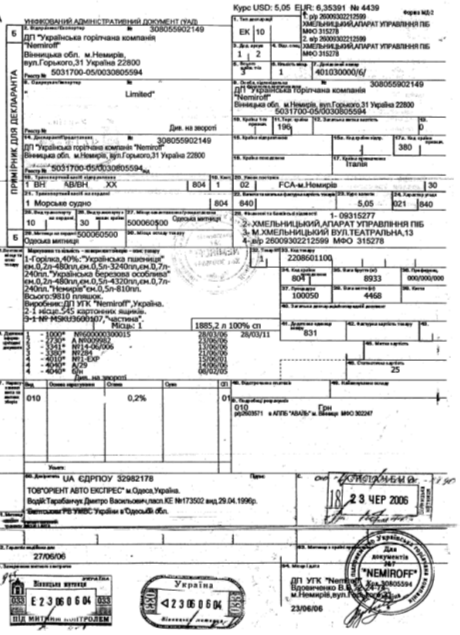Рис.3. Приклад оформлення експортної ВМД при експорті горілчаної продукції в США морським транспортом (з доставкою контейнерів до морського порту по Україні митним перевізником)