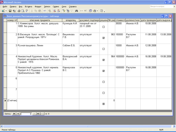 В базу данных для Россвязьохранкультуры (таблицу №1) вносим следующие названия полей: номер п/п; описание предмета; владелец; документ, подтверждающий право владения предметом; решение об отнесении данного предмета к категории КЦ; № разрешительного документа; стоимость в рублях; должностное лицо, выдавшее разрешительный документ; дата проведения экспертизы; дата выдачи разрешительного документа.