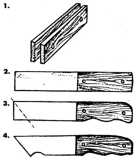 Легированные и быстрорежущие стали отжигают и закаливают при значительно более высоких температурах, но их термическую обработку в домашних условиях делать нельзя. Изготовлять из такой стали инструмент можно только холодным способом на абразивном круге и точильном бруске. Они не поддаются сверлению, отпиливанию ножовкой или обработке напильником. Поэтому выбранная заготовка из такой стали (так же как и напильник из углеродистой стали, если речь идет о холодном способе обработки) должна более или менее соответствовать форме и размерам изготовляемого инструмента. Эту заготовку доводят на абразивном круге (или алмазном круге с тонким диском), на наждачном бруске и с помощью алмазного надфиля — для незначительного стачивания стали. Такими заготовками могут быть: машинное ножовочное полотно для изготовления ножа, резака, тесака (взамен топора); трубка соответствующего диаметра для полукруглых стамесок и резцов; дисковые фрезы для пластинчатых режущих инструментов (цикли, резаки типа "коготок", скоблюш-ки, плоские стружки, фигурные железки для калевок и др.); полуобоймы шарикоподшипника, отвертки, автомобильные рессоры, клапаны и т.д.