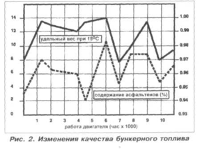 Рис. 2 показывает изменение содержания асфальтенов в топливе и его удельной плотности за период испытаний на судне в течение 18 месяцев, которые выявили близкую корреляцию этих двух характеристик топлива. Во время этих испытаний двигатель работал в течение 4500 час. на топливе с низким содержанием асфальтенов, и в кулачковом приводе не было обнаружено отложений, но когда топливо сменили на другое, с очень высоким содержанием асфальтенов, то уже через 2000 час. В кулачковом приводе и картере были обнаружены большие отложения. В обоих случаях использовалось одно и то же смазочное масло.