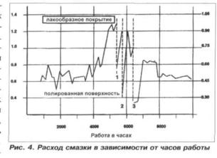 На рис. 4 показано влияние лакообразующего нагара на эффективность смазывания и расход смазки по результатам экспериментальных исследований на двигателе голландского рыболовного судна, которые подтверждаются данными по другим судам. На этих судах двигатели работали с большими перегрузками и использовали низкокачественное дизельное топливо MGO. При работе двигателей с меньшей мощностью вследствие снижения сопротивления трала расход масла возвращается к нормальному уровню. Это означает, что в случае уменьшения действия этих факторов образование нагара на втулках сокращается.