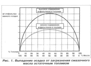 На рис. 1 показаны результаты исследований по методу IP375 топлива с высоким и низким содержанием асфальтенов, согласно которым первое больше способствует отложениям в двигателе. Как известно, качество бункера в мире различно, и содержание асфальтенов может изменяться от 2 % до 11 %.