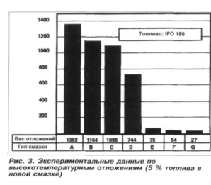 На рис. 3 показано количество высокотемпературных отложений, которые возникают вследствие загрязнения смазочных материалов из-за применения низкокачественного топлива. Как следует из сравнения представленных гистограмм, использование химических добавок в смазочном масле обеспечивает резкое снижение асфальтеновых отложений.