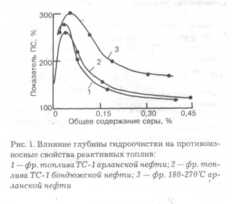 С проблемами ухудшения противоизносных свойств топлив столкнулись в 70-х годах при использовании реактивных топлив, подвергнутых жесткой гидроочистке. Тогда же было установлено, что существенное влияние на противоизносные свойства товарных реактивных топлив оказывают не только сернистые соединения, но и фракционный состав, вязкость топлива. Удаление естественных гетероорганических соединений из прямогонных реактивных топлив (сернокислотная, адсорбционная, гидроочистка) значительно ухудшало их противоизносные свойства. При исследовании влияния содержания серы на противоизносные свойства реактивных топлив было установлено, что существует определенный оптимум, при котором достигается максимальный уровень противоизносных свойств топлива (рис. 1)[1],