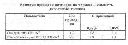 Известно, что соединения меди являются сильными промоторами окисления углеводородов. Поэтому было проверено влияние присадки на термостабильность дизельного топлива методом квалификационной оценки Установлено, что после нагрева в течение 16 ч образцов топлива при 100°С их цвет не изменился, а количество осадка и кислотность возросли незначительно (см. таблицу).