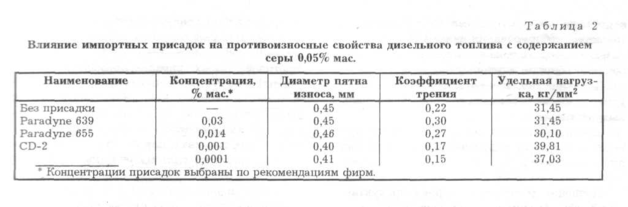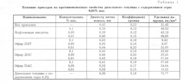 При решении проблемы подбора эффективной присадки авторами статьи поставлена задача использования только тех присадок, которые могут придать топливам смазывающую способность на уровне, характерном для дизельных топлив с содержанием серы - 0,2% мае. И ароматики 25-30% мае.