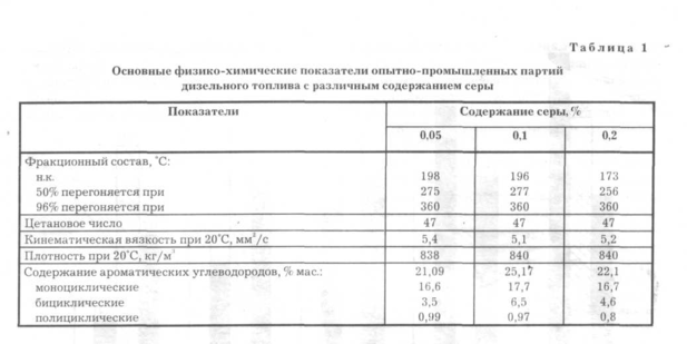 Для исследования влияния глубины гидроочистки на противоизносные свойства дизельных топлив были специально приготовлены образцы дизельного топлива с различным содержанием серы — 0,05; 0,1; 0,2% мае. (табл. 1)Топлива имели близкие значения по показателям вязкости, плотности, содержанию и составу ароматических углеводородов, что исключало влияние их на противоизносные свойства топлив, лишь образец с содержанием серы 0,2% имел более низкую 50%-ную точку перегонки — 256°С против 275 и 277°С для образцов с содержанием серы 0,05 и 0,1%, соответственно, так как для поддержания на одном уровне всех остальных свойств в его состав пришлось вовлечь фракции керосина. Все образцы соответствовали ГОСТ 305-82.