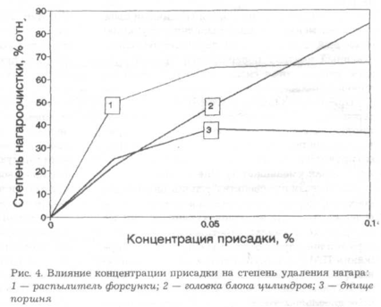 Часть нагара, которая не была удален в процессе испытаний, изменила свою природ; Нагар стал рыхлым и легко снимался притиранием поверхности без соскабливания и кипячения. Наибольший эффект наблюдался на распылителе форсунки, где при концентрации пру садки 0,02% в условиях испытаний нагар удалялся наполовину. Интересно отметить, что степень удаления нагара с форсунки и поршня достигала максимума при 0,05% присадки, а из камеры сгорания почти линейно зависела от е концентрации.