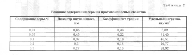 Из приведенных данных видно, что с увеличением содержания серы с 0,01 до 0,5% улучшаются противоизносные свойства дизельных топлив. Так, диаметр пятна износа и коэффициент трения уменьшаются на 68 и 75% соответственно, при этом удельные нагрузки увеличиваются в 10 раз. За рубежом критерием оценки противоизносных свойств является уровень показателей, значения которых характерны для дизельного топлива с содержанием серы 0,2% мае.