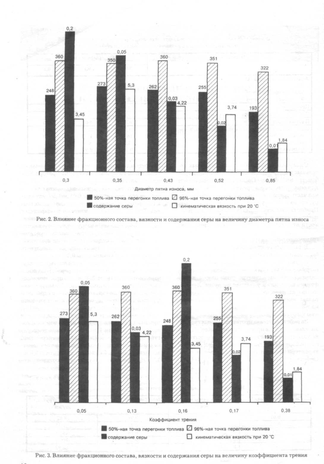 С повышением температуры конца кипения топлива снижается диаметр пятна износа и коэффициент трения. При этом средняя температура кипения топлива (50%-ная точка перегонки) не оказывает заметного влияния на противоизносные свойства. Снижение вязкости с 5,3 до 3,7 мм2/с приводит к ухудшению противоизносных свойств: увеличивается диаметр пятна износа и коэффициент трения.