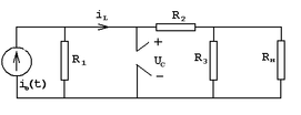 Сведем динамическую цепь к резистивной (заменим С-элемент источником напряжения, а L-элемент заменим на источник тока):