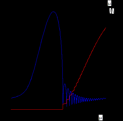 | Рис.1. Изменение радиуса пузырька и положения его центра во времени. |