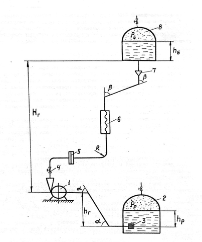 над віссю насоса. Величини абсолютних тисків на вільних поверхнях рідини резервуара і бака рівні відповідно РР та РБ. На всмоктуючій лінії - дискова засувка 4 і зворотний клапан 7. У системі можлива установка витратомірної шайби (діафрагми) 5, або охолоджувача 6.