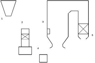 1-бункер сырого угля, 2- МВ, 3-горелки, 4- короб горячего воздуха, 5- воздухоподогреватель.
