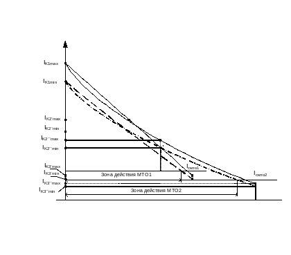 Зона действия отсечки определяется обычно графическими построениями как точка пересечения кривой изменения тока КЗ в минимальном и максимальном режимах работы сети в зависимости от длины лини или её реактивного сопротивления и прямой тока срабатывания защиты. Отсечка считается эффективной, если зона её действия охватывает не менее 20–25% длины линии. Графические построения показаны на рис. 4.