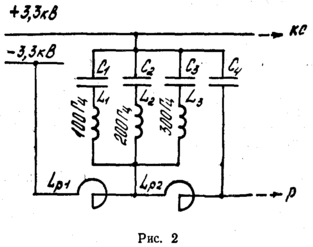Чтобы обеспечить нормальную работу линии связи, проходящей вдоль заданного участка контактной сети, необходимо на тяговых подстанциях установить сглаживающие фильтр-устройства. Принципиальная схема такого устройства приведена на рис. 2. Фильтр-устройство содержит два реактора, три резонансные параллельные ветви, настроенные на 100, 200 и 300 Гц, и четвертую емкостную параллельную ветвь, предназначенную для подавления гармоник более высоких порядков. В нашем случае значение емкости С4 достаточно взять 32 мкФ, при котором не будет превышаться допустимое значение напряжения шума Uшн. Это позволит уменьшить затраты на комплектацию фильтр-устройства.