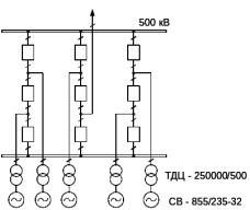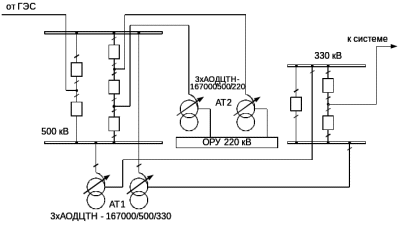 – ОРУ 500 кВ: количество присоединений = 5 (1×ВЛ 500 кВ + 2×АТ 500/330 + 2×АТ 500/220). Выбираем схему «трансформаторы – шины с полуторным присоединением линий»