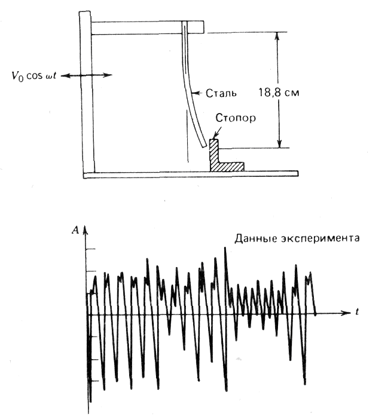 Пружний стрижень з нелінійними граничними умовами. Для того, щоб отримати хаотичні коливання в механічній системі, не обов'язково мати декілька положень рівноваги. Будь-яка сильна нелінійність також, швидше за все, викличе хаотичний шум при періодичній зовнішній дії. Одним з прикладів системи з одним положенням рівноваги є пружний стрижень з нелінійними граничними умовами. Нелінійними називаються такі граничні умови, які залежать від руху. Наприклад, передбачимо, що кінець стрижня може вільно рухатися в одному напрямі, а рух в іншому напрямі заборонений. Хаотична поведінка такого стрижня показана на рис. 3.4. Модифікацією цього прикладу є двостороннє обмеження із зазором, при якому вигин стрижня може відбуватися в трьох різних режимах.