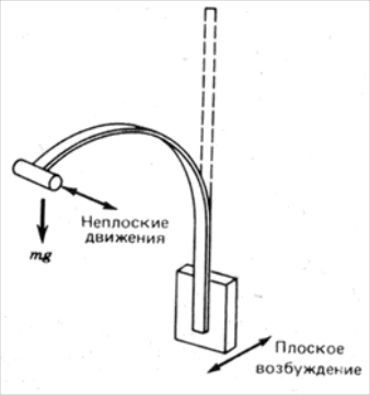 За певних умов вимушений плоский рух нелінійного пружного стрижня (балки, смужки) описуваний рівнянням (3.3), стає нестійким і виникають тривимірні рухи. Схоже явище відоме і для плоского руху натягнутої струни. Було проведено декілька експериментів з товщиномірами — дуже тонкими, гнучкими, пружними сталевими стрижнями прямокутного перетину (наприклад, 0,25 мм x 10 мм x 20 см) (мал. 3.5). Їх слабкий бічний рух (по відношенню до незігнутого стрижня) майже неможливий без подовжнього вигину або перекосу локальних поперечних перетинів. Проте при сильному вигині в «дозволеному» напрямі стають можливими і бічні зсуви, що супроводяться перекосом поперечних перетинів.