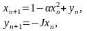де J — визначник якобиана, службовець коефіцієнтом стискування майданів при відображенні. У дослідженнях мэрилендской групи коефіцієнт J був вибраний рівним -0,3, а параметр ? варіювався в певних межах. Наприклад, при ? > ?0 = 1,062371838 спостерігалося народження з траєкторій з періодом 6, дивного аттрактора, що складається з 6 окремих часток, який існує в діапазоні ?0 < ? < ?c = 1,080744879