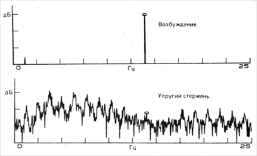 Рис. 3.6. Фурье-спектри вимушених коливань тонкого пружного стрижня. Широкосмуговий хаотичний спектр є наслідком тривимірності коливань.