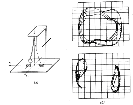 Зігнутий стрижень з двома мірами свободи. Щоб вивчити роль додаткових мір свободи, був створений пружний аналог сферичного маятника, в якому використаний стрижень кругового перетину. Для вигинання стрижня як і раніше використовувалися магніти, але тепер його кінець міг рухатися в двох напрямах. В результаті з'явилися несумірні природні частоти і квазіперіодичні коливання, які врешті-решт перетворилися на хаотичних (рис. 3.3).