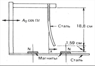 Рис. 3.2а. Пружний сталевий стрижень, зігнутий магнітними масовими силами і прикріплений до періодично рухомої підстави.