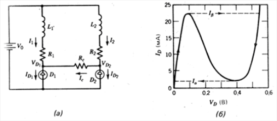 Нелінійними елементами цього ланцюга є два тунельні діоди. Вольт-амперна характеристика, показана на мал. 3.11, би, явно нелінійна, і при циклічних змінах струму ID виникає петля гістерезису.