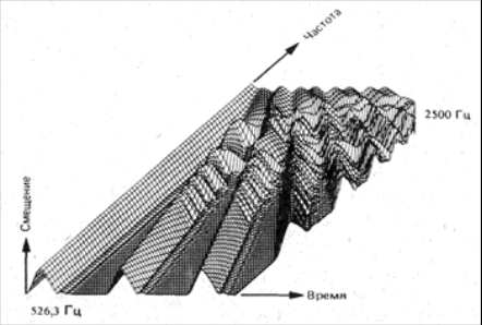 Рис. 3.8. Зсув голки матричного друкуючого пристрою як функція часу при різних частотах сигналу, що ініціює.