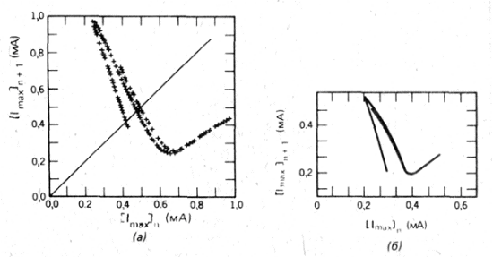 Рис. 3.10. Порівняння розрахованого (а) і отриманого в експерименті (б) одновимірних відображень для ланцюга з варикапным діодом, показаного на мал. 3.9.