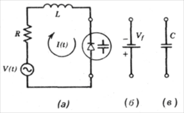 Рис. 3.9. а - Схема ланцюга з варикапным діодом; би - вид елементу ланцюга у фазі провідності діода; у – вид елементу ланцюга, коли діод замкнутий.