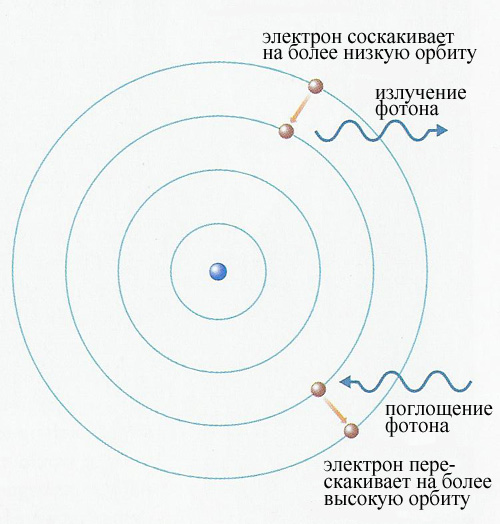 В картине атома по Бору, таким образом, электроны переходят вниз и вверх по орбитам дискретными скачками — с одной разрешенной орбиты на другую, подобно тому, как мы поднимаемся и спускаемся по ступеням лестницы. Каждый скачок обязательно сопровождается испусканием или поглощением кванта энергии электромагнитного излучения, который мы называем фотоном.