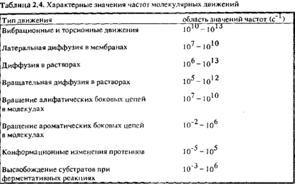 Простейший путь состоит в том, чтобы задать предельные значения времен, и в этом случае все физические явления описывать как быстрые или медленные по сравнению с этими значениями. Очевидно, что времена, задающие масштаб, зависят также и от того, какие физические процессы описываются в данном приближении. При этом существует не одна временная шкала ЯМР, а множество различных шкал в зависимости от типа рассматриваемых взаимодействий. С теоретической точки зрения наиболее сложной для обсуждения является промежуточная область, в которой не реализуются при предельных случаях: быстрых и медленных процессов. Независимо от используемой шкалы ЯМР физические процессы, связанные с различными движениями, обладают своей собственной шкалой времени, которая может быть описана временами корреляции или характеристическими частотами. В табл. представлены типичные интервалы частот для основных молекулярных движений: от очень медленных – с характеристическими временами от нескольких минут до нескольких часов до очень быстрых – в пикосекундной области.