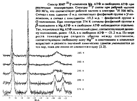 Устойчивость Mg.ATO-KOMiDieKca зависит от температуры. В больших магнитных полях переход от медленного к быстрому обмену происходит примерно при 25°С. При низких температурах можно отдельно наблюдать сигналы от Mg.ATO и свободного АТФ. При повышении температуры наблюдается усредненная резонансная линия, положение которой зависит от концентрации реагентов.