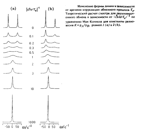 Для описания поведения в промежуточной области такое простое соотношение отсутствует, однако можно вычислить в явном виде положение сигнала ЯМР как функцию времени корреляции обменного процесса Te. Условия медленного обмена приводят к уширению обеих линий, а при ускорении обмена – к слиянию их в одну уширенную линию при выполнении условия I Aoxe \ ~ 1. При дальнейшем возрастании скорости обмена линия будет сужаться до тех пор, пока ее ширина не станет равной ширине линии в отсутствие обмена.