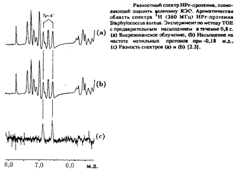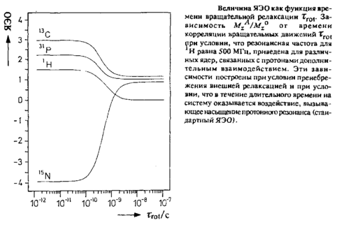 ЯЭО от длительности насыщающего импульса или длительности интерва-ламежду 180°-ным и 90°-ным импульсами, то первоначальное возрастание определится межатомным расстоянием Tab между рассматриваемыми спинами. Определение расстояний: с помощью эффекта Оверхаузера является существенным элементом алгоритма установления структуры биологических макромолекул с помощью ЯМР.