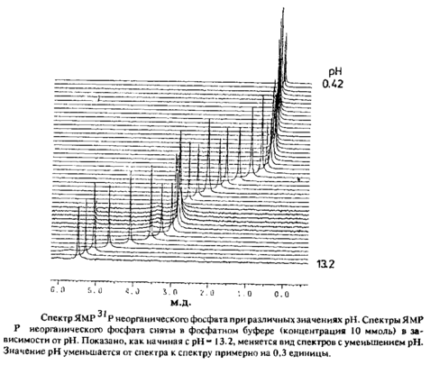 Неорганический фосфат принимает участие во многих ферментативных реакциях, поскольку он либо переносится на субстрат, либо расщепляется. Кроме того, неорганический фосфат принимает на себя функцию буфера. Для фосфатной группы существуют кроме двух различных протонированных форм в равновесии еще и следующие формы: Н3РО4, H2PO4 », HPO42 », PO43 ». При измерении спектров ЯМР 1P для различных значений рН мы всякий раз наблюдаем один сигнал, химический сдвиг которого изменяется в зависимости от концентрации ионов гидроксония. Такой вид спектра полностью соответствует случаю быстрого обмена.