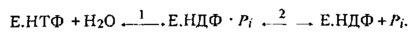 Изотопный обмен 18O может быть использован для более полного изучения реакций ферментативных превращений. При катализе большая группа ферментов расщепляет фосфаты, ответственные за энергозапас, и таким образом осуществляется перенос фосфатной группы или на другой субстрат или на окружающую воду. При ферментативном гидролизе нуклеозидтрифосфата, ответственного за энергозапас клетки, в качестве промежуточного продукта возникает такое состояние фосфатной группы, при котором связь с ангидридом фосфорной кислоты уже расщеплена, однако фосфатный остаток P1 – еще связан с нукле-озиддифосфатом и присоединен к ферменту Е. Формально эту реакцию можно представить в виде следующего уравнения: