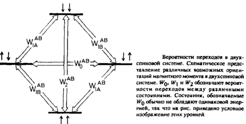 Простейшей системой, позволяющей достаточно наглядно продемонстрировать ЯЭО, является молекула, в которую входят два спина А и В, связанные диполь-дипольным взаимодействием, причем Ia = Ib – 1/2. Если провести усреднение по большому числу таких молекул, то каждой молекуле можно поставить в соответствие 4 возможных состояния, характеризуемых определенными населенностями, т.е. установить, с какой вероятностью населено каждое из состояний. В состоянии термодинамического равновесия имеет место распределение Больцмана. Если нужно изменить населенности, облучая спиновую систему на частоте, соответствующей резонансной частоте ws спина В, то вследствие диполь-дипольного взаимодействия произойдет изменение населенностей всех спиновых состояний. При условии, что облучение проводится в течение длительного времени, в системе установится новое стационарное состояние. Возникающие при этом релаксационные процессы можно в зависимости от изменения суммарного квантового числа m ядер А и В обозначить как нульквантовые, одноквантовые и двухквантовые.