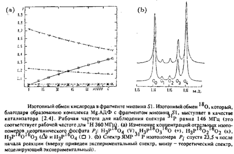 Проведение изотопного замещения по 17O, спин которого равен 5/2, приводит к расщеплению сигнала фосфора в секстет. Наличие квадрупольного момента у кислорода уменьшает время релаксации ядерного спина 7O. Спин-спиновое взаимодействие с ядром 31P позволяет получить представление об эффективных механизмах, дающих дополнительный вклад в релаксацию. Если с атомом фосфора связаны больше одного атома 17O, то линия приобретает сложную мультиплетную структуру, так что интенсивность сигнала уменьшается, и его уже трудно отличить от фона. Иная картина наблюдается для изотопа 18O. Этот изотоп, как и изотоп 16O, наиболее распространенный в природе, обладает нулевым спином и не вызывает появления дополнительной структуры в наблюдаемой спектральной линии. Правда, замена атома 16O в фосфатной группе на атом О приводит к небольшому высокопольному сдвигу резонансной линии на 0,025 м.д., причем этот сдвиг пропорционален числу связанных с атомом фосфора тяжелых изотопов. При этом можно наблюдать сигнал ЯМР 31P от фосфатной группы отдельно, что позволяет установить число атомов 1 О.