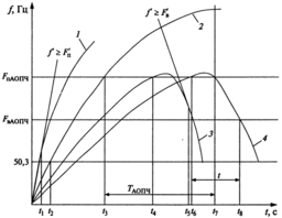 Если изменение контролируемой частоты в системе будет происходить по линии 3, когда f ' > F', то отключение нагрузки произойдет в момент времени t1.
