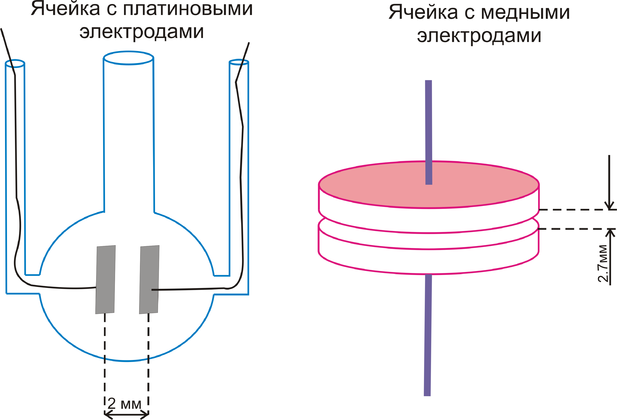 Магнитная жидкость заливалась в измерительные ячейки двух видов. Одна из них имеет платиновые электроды, другая медные. Конструкции ячеек отличаются друг от друга, их схемы приведены на рисунке 1.