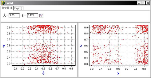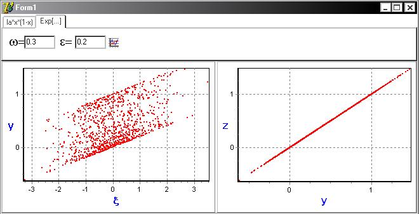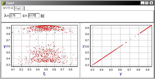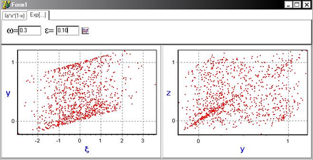 ) обе системы в один момент дискретного времени принимают разные значения (точки, характеризующие состояние систем, распределены по плоскости (y,z)), а следовательно не существует функциональной зависимости между случайным процессом и состоянием динамической системы.