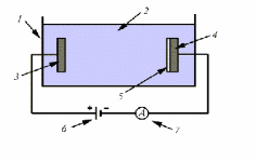 1 – ванна, 2 –электролит, 3 – анод, 4 – катод, 5 – пленка, 6 – источник питания, 7 – амперметр.