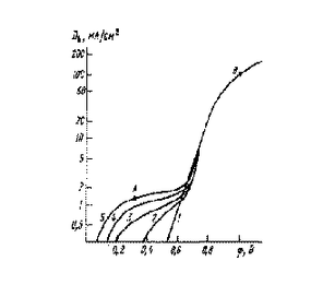 На рисунке 3.3 приведены совмещенные диаграммы Пюрбаха меди и никеля [4,5]. Из них видно, что при потенциале катода в области I на катоде будет осаждаться только медь. Если потенциал находится в области II, то будут осаждаться как медь, так и никель. В технологии электролитического осаждения многослойных структур из одного электролита используется электролит, содержащий соли обоих металлов. Предельная плотность тока осаждения каждого элемента в этом случае зависит от его концентрации в электролите. На рис. 3.4 в качестве примера приведена зависимость плотности тока осаждения меди от потенциала катода для электролитов с разным содержанием ионов меди. Из солей металлов в состав электролита входили никель сернокислый (NiSO4), никель хлористый (NiCl2) и медь сернокислая [5]. Кривая 1 соответствует простому электролиту, содержащему только ионы никеля с потенциалом насыщения, соответствующего точке В (сравнить с данными рисунке 3.2). По мере увеличения в электролите ионов меди в вольтамперной зависимости процесса электролитического осаждения наблюдается вторая область насыщения (точка А), которая определяется предельной плотностью тока осаждения меди. при значительно меньших потенциалах на катоде. Отсюда следует, что при потенциале катода 100…500 мВ (точка А, рисунке 3.4) на нем будет осаждаться чистая медь, так как этого потенциала еще недостаточно для осаждения никеля. Если теперь резко поднять потенциал катода до величины приблизительно 1000 мВ (точка В на рисунке 3.4), то выделяться будет практически только никель, так как скорость осаждения меди остается малой в сравнении со скоростью осаждения никеля.